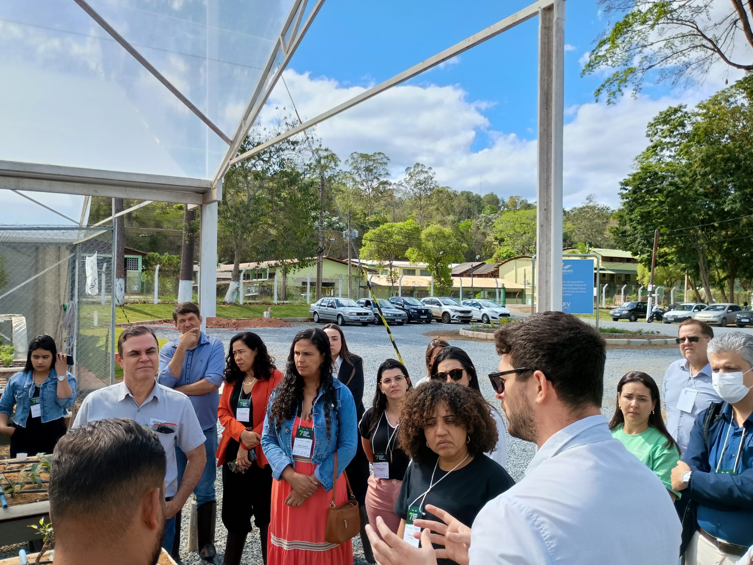 Ainda no primeiro dia, realizamos uma visita à Unidade Embrapii Fibras Florestais, conhecendo viveiros de pesquisa e inovações em andamento. Profissionais da sede apresentaram ao grupo os viveiros de pesquisa da unidade, destacando os projetos e as inovações desenvolvidas no local.